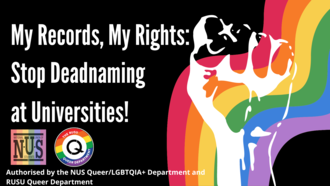 Stop Deadnaming at Universities!Our universities are failing when it comes to building inclusive and supporting learning environments for transgender, gender diverse and non-binary students. A recent survey of queer students in Australia conducted by the NUS Queer/LGBTQIA+ Department and RUSU Queer Department identified that every single respondent regularly experienced some form of deadnaming at university. The results from the survey revealed that: 83% of students said there was a persistent deadnaming issue at their university 93% were deadnamed on student facing platforms 20% were deadnamed by staff 43% were deadnamed on university accounts 13% were deadnamed on their student ID With the constant misgendering and deadnaming that occurs on student facing platforms and within classrooms, it is time for this issue to be addressed. We are calling on universities to end deadnaming and change their ways to ensure that the wellbeing of transgender, gender diverse and non-binary students is a priority. Universities have a duty of care towards their students, a responsibility to provide a safe learning environment that minimises opportunities for psychosocial harm. They need to acknowledge that until action is taken to end deadnaming in Australian universities, trans, non-binary and gender diverse students will continue to be at severe risk of bullying, harassment, physical violence and psychosocial harm. It is time for universities to protect vulnerable students and allow them to bring their whole selves to their studies.2,398 of 3,000 SignaturesCreated by NUS Queer/LGBTQIA+ Department