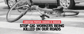 Enough is enough. Stop gig workers from being killed on our roads.Delivery riders work night and day for an average of just $10.42 an hour*. They often have to work 50 - 60 hours a week to cobble together a basic income. They have no right to insurance when they get injured or die on the road, and it is at the discretion of huge multinational companies like UberEats and Doordash as to whether their families get supported. A survey conducted by the Transport Workers Union in September found that 73% of food delivery riders are worried about being ‘seriously hurt or killed’ at work. And their fears are clearly not unfounded. The Federal government must step up and take responsibility for workers being killed on the job by pulling these cowboy companies into line.6,688 of 7,000 SignaturesCreated by Transport Workers Union and Young Workers Centre